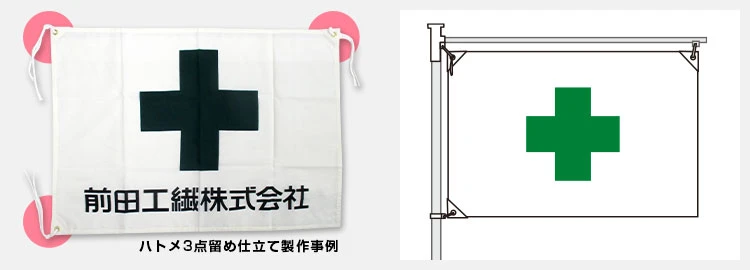 工事現場に掲揚する社旗や安全旗はハトメ3点留めがお薦めです。