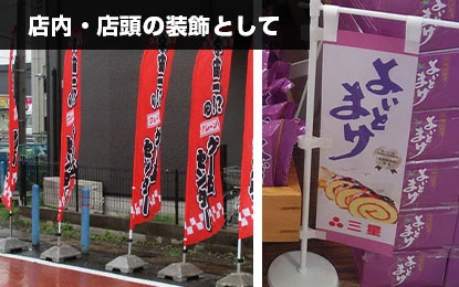タペストリーや腰幕などは店舗内の装飾として空間演出に役立つほか、店頭幕やフラッグ・のぼり旗などは屋外に置けば店舗看板代わりとなり、店舗名や看板商品を効果的にアピールすることが可能です。