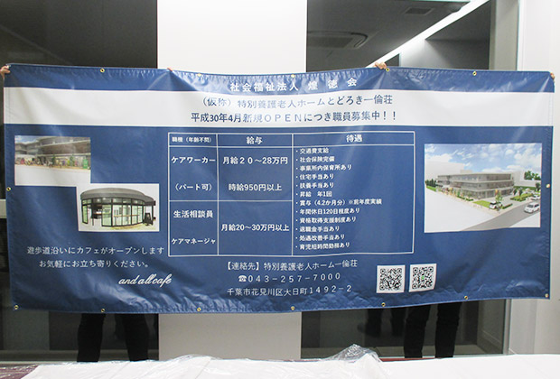 遮光ターポリンという素材で作って頂いたのですが、本当に透けないのですね。印刷された広告がくっきりはっきりと、遠くからでも確認できます。