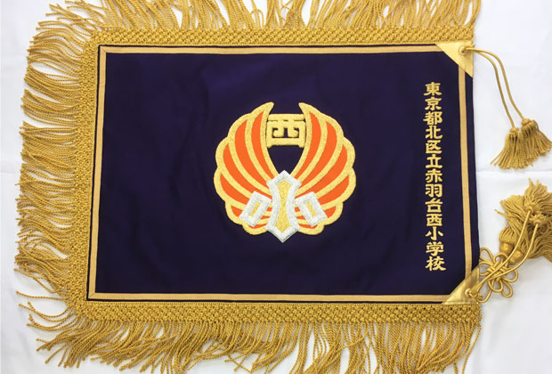 - 校章・学校名を総手刺繍(金糸・銀糸/変縫にて模様を表現)
